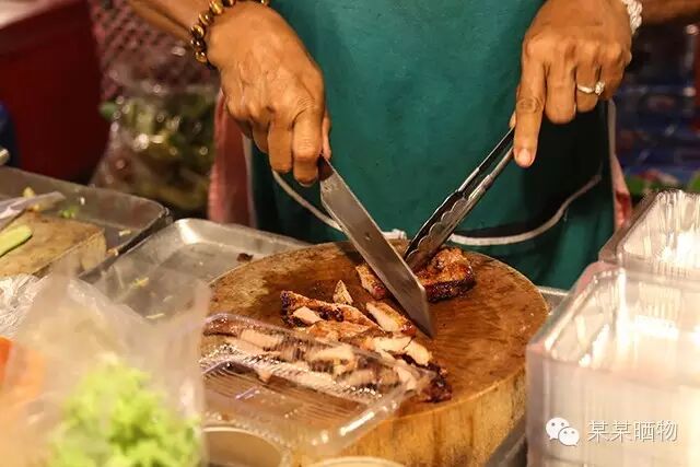 還有各種烤海鮮,魷魚小姐的爆膏魷魚(THB20)和服務態度都要點贊,我們只不過買了兩串魷魚,她非常細心地幫我們把軟骨去掉,然後配上包得妥妥 的辣醬。話說這種由魚露、檸檬汁、鮮辣醬和各種香草調成的泰式酸辣醬充分糅合了重口味和小清新,無論是配肉還是海鮮都很搭,幾乎每家店都有,但每家都有獨 特的調配技巧。(神馬“泰式甜辣醬”滾開好麼!)