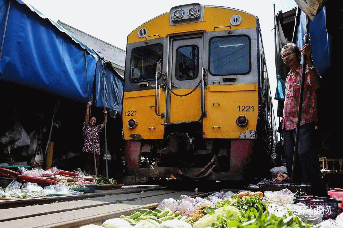 窄小的鐵道兩側擠滿了販賣各種鮮果蔬菜、雞鴨魚肉、海鮮、醬料的攤位,鐵軌上滿是來採買的當地人,幾乎把路軌淹沒。列車快要抵達前,擴音器裡會傳來提醒,這個時候,攤販們會不慌不忙地把貨品往兩旁移,嫻熟地收起遮陽帳篷,火車離開後又火速恢復傳統市場的平實模樣。