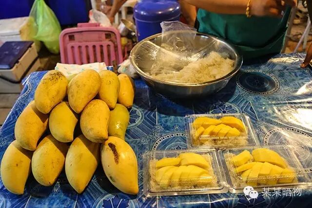一種叫Khanom chin的細米粉,用發酵過的米製成,質感特別嫩滑。一般賣Khanom chin的店都是煮著幾大鍋不同的汁料讓客人自己挑選,有的是用剁碎的魚肉與咖哩煮成,有的是青咖哩雞,有的加了椰奶味道比較溫和,全都經過長時間熬煮, 香料和配料的味道充分釋放到湯汁之中,澆在米粉上真是好棒。Khanom chin店還有也個特點就是桌子上會擺著無限量供應的新鮮香草,以及豆芽、青瓜和豆角等蔬菜,讓大家自己發揮。最佳飯後甜品——芒果糯米飯 (THB60),在泰國吃芒果是實在太划算。