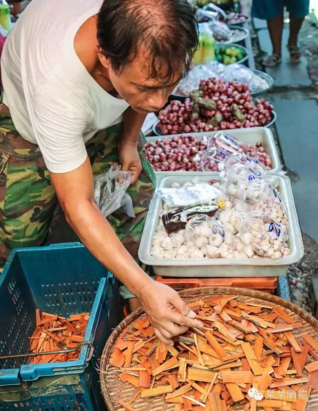這位賣“木片”的大叔非常好人,讓我們站在他的攤位,還指導我們佔據有利的拍照位置。列車過來的時候我狂按快門,咦,怎麼背後有股強大的力量拉著 我,原來是大叔看到我和列車貼得太近,怕有危險,一邊撐自己的遮陽帳篷一邊拉著我的背囊,真是十分窩心。大叔賣的“木片”原來是當地涼茶的原材料,煮成水 喝有下火的功效,整個市集只有他獨家出售。